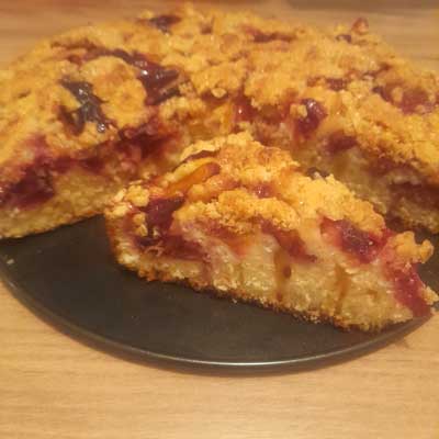 Utisak: Kombinacija mekane kore, voća i hrskavog krambla. Meni je lepše testo kad se umesto mleka koristi grčki jogurt, bude vlažnije ( kao u prvom receptu na: https://www.jednostavanzivot.rs/brz-i-brzi-desert-sa-kupinama/ ). Mada je možda zbog alkohola koji se dodaje šljivama za ovo bolja ova malo suvlja varijanta. Sve u svemu, brzo, jednostavno i ukusno.