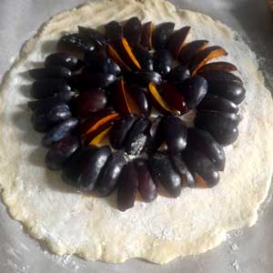 - Na oko 4 cm od ruba kore naređajte šljive u krug ( ako ste u mogućnosti malo bolje nego na slici 2. ).